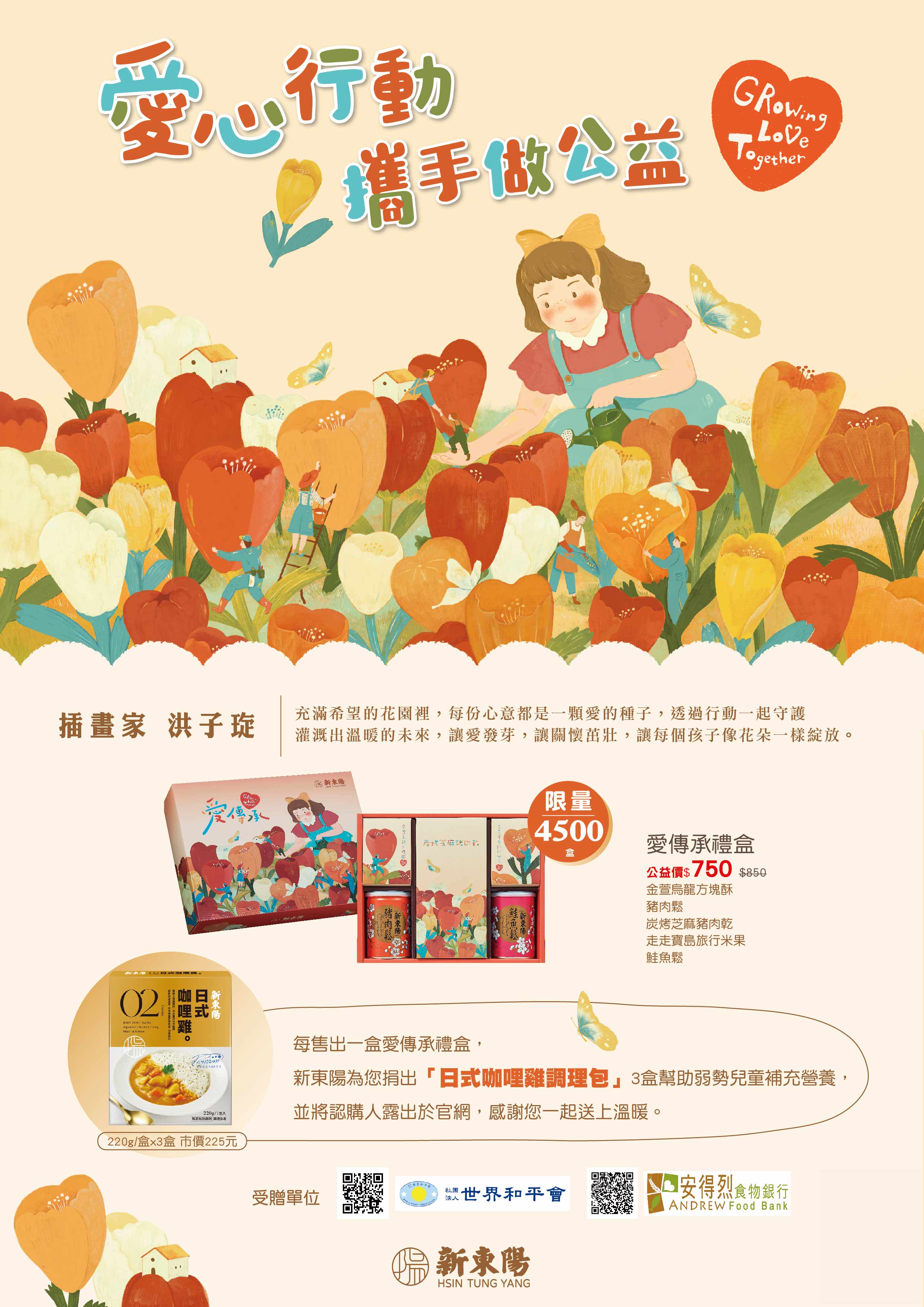 認購「愛。傳承禮盒」,新東陽幫您捐出價值225元的「日式咖哩雞調理包」3盒,幫助弱勢兒童補充營養,並將認購人露出於官網,感謝您一起送上溫暖,讓愛不斷傳承。 認購禮盒請洽:門市查詢、線上購物網 受贈單位:世界和平會、安得烈食物銀行 感謝以下認購單位及個人(不定期更新,排序不分先後,僅以購買順序排列): 台灣中小企業銀行-大園分行