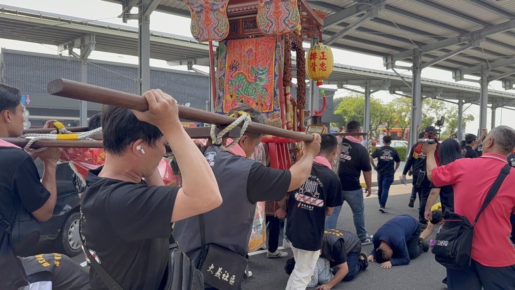「國道媽祖」的雲林縣西螺廣福宮「老大媽」今抵西螺服務區,將展開南北巡平安遶境,首日吸引不少旅客鑽轎底祈求行車平安。記者蔡維斌/攝影