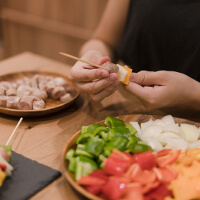 依照自己喜愛的順序將香腸、時蔬串成烤串