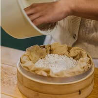 將洗好的糯⽶放進蒸籠蒸30~40分鐘