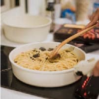 先把麵條放入滾水中煮熟(約8-10分鐘),捞起瀝乾水分備用;將新東陽墨魚香腸和飛魚卵香腸切片,大蒜切末,洋蔥切丁狀。